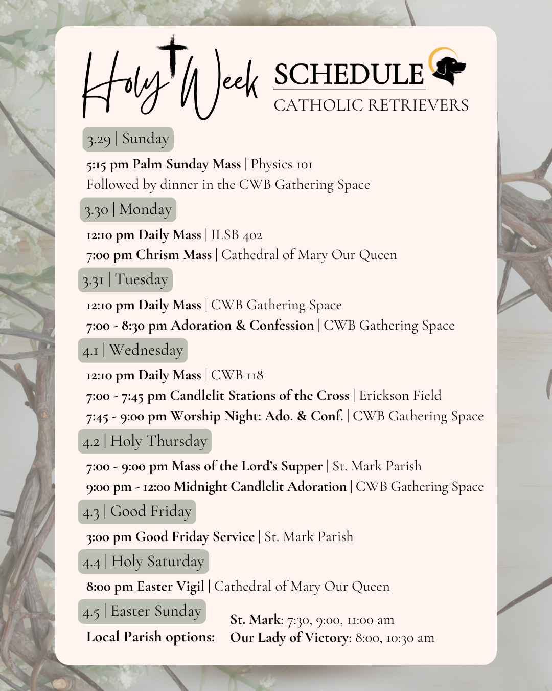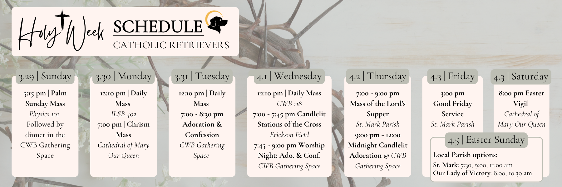 Join us for our SPRING RETREAT! A great time to step away from schoolwork and spend time with the Catholic Retrievers community!